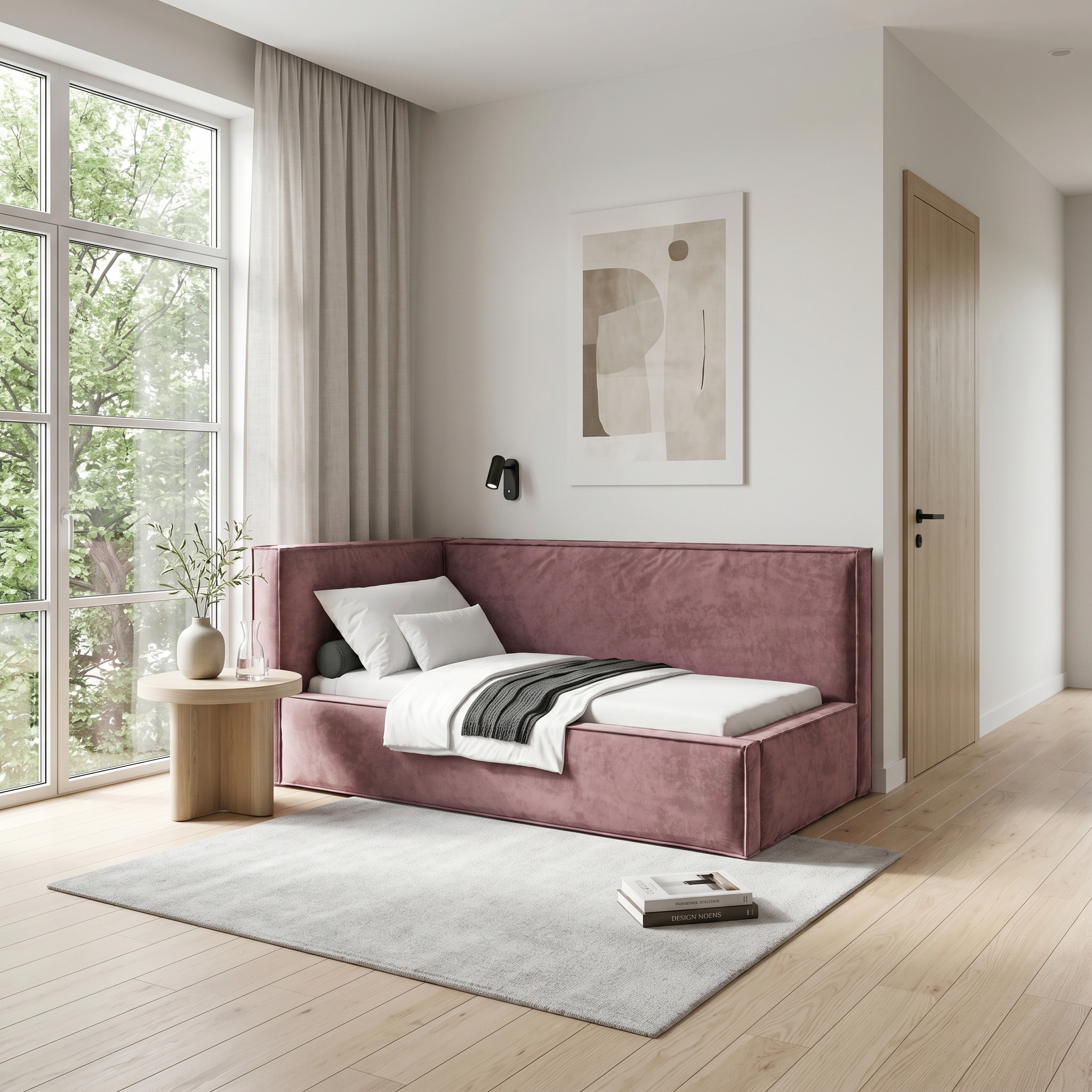 Все элементы сложного изголовья и корпус обтянуты приятным на ощупь и практичным мебельным велюром Nebby.