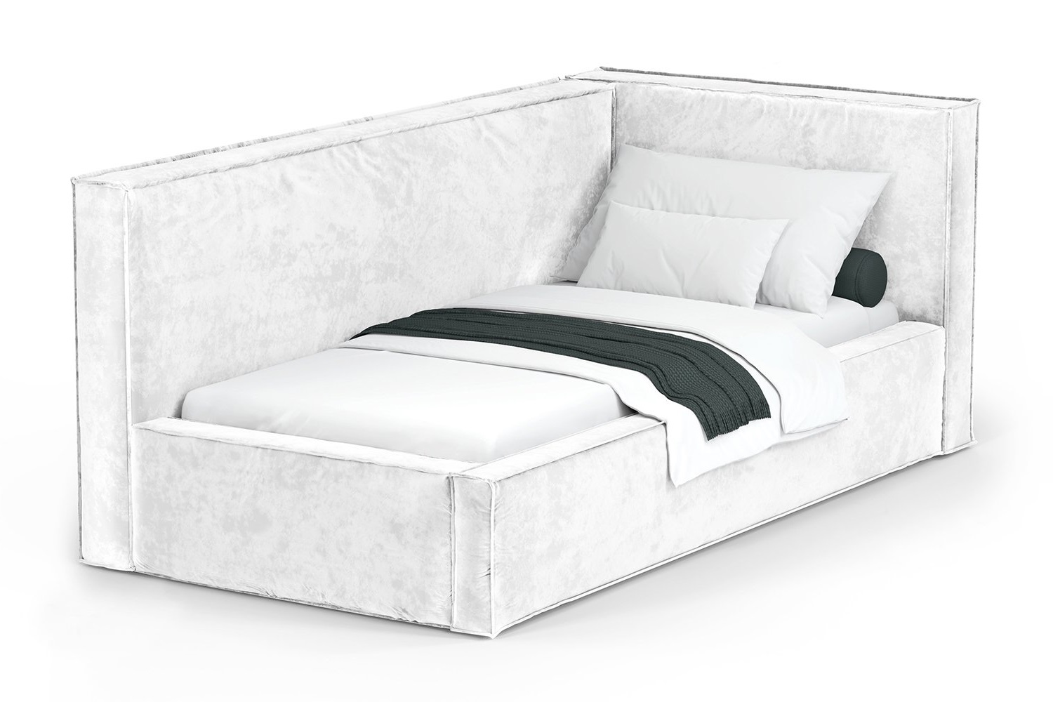 Все элементы сложного изголовья и корпус обтянуты приятным на ощупь и практичным мебельным велюром Nebby.