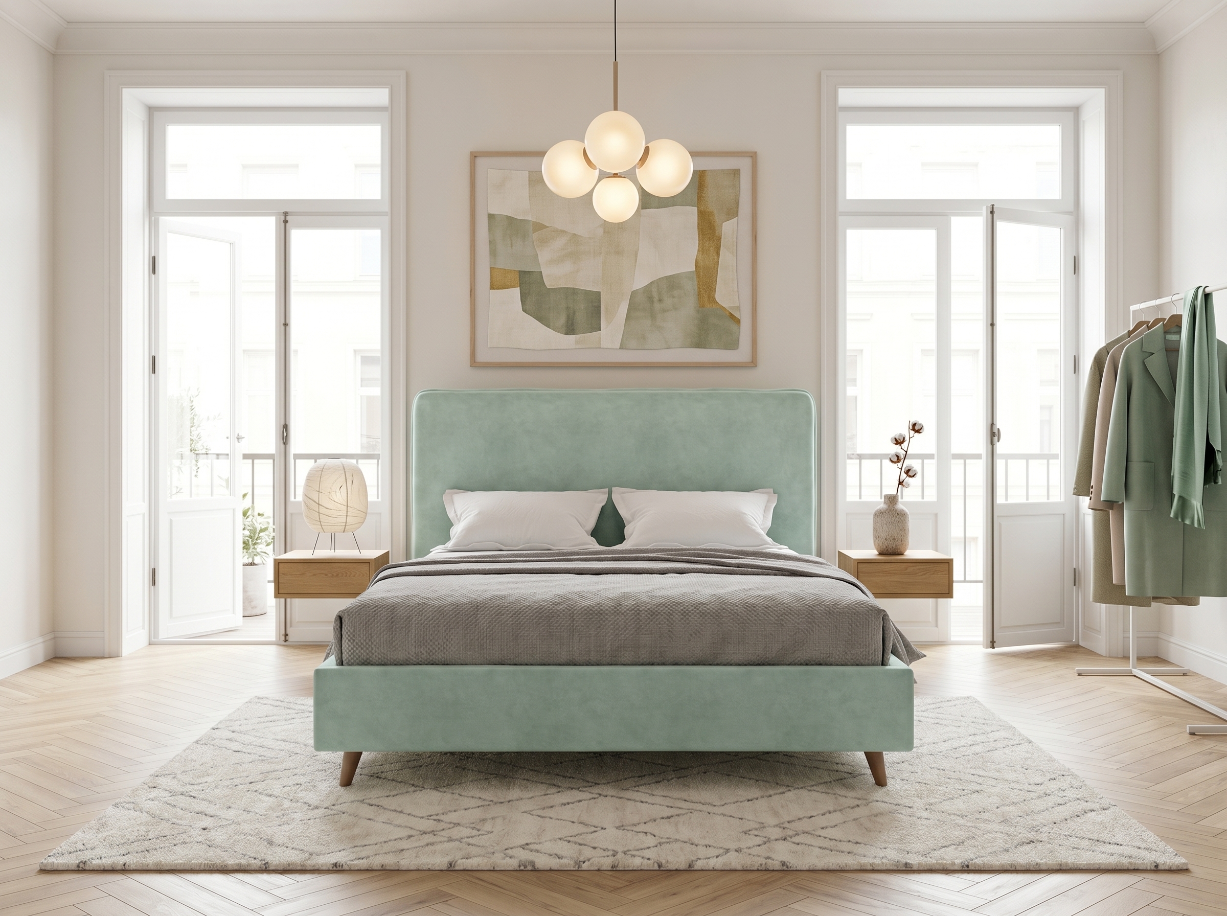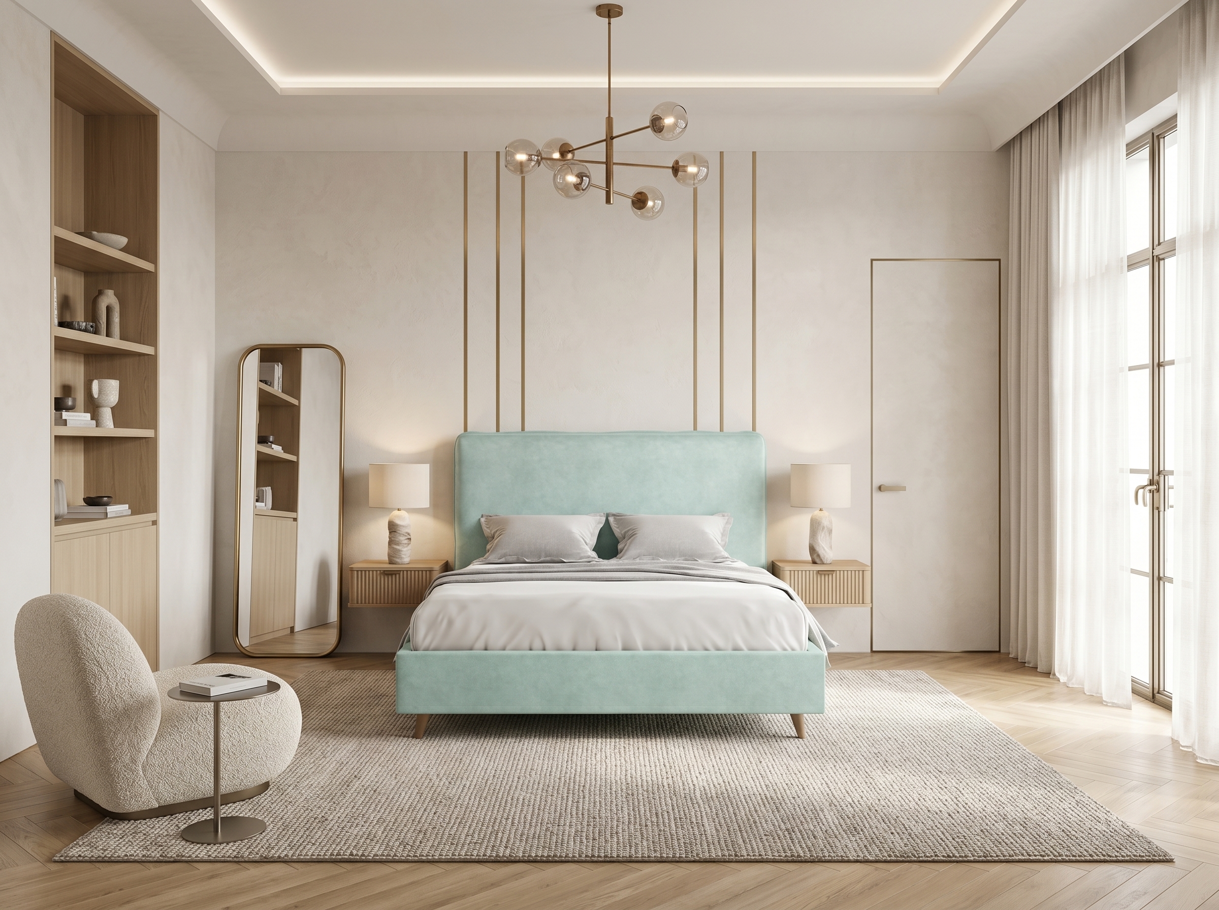 Модель выполнена в стиле неоклассика, имеет мягкие формы располагающие к расслабленному отдыху. Массивное основание на ножках массива и с мягким изголовьем. В комплект входит ортопедическое основание .Материалы используемые в производстве: Брус,МДФ , ЛДСП,ППУ, обивочный материал велюр. Ткань Velutto.